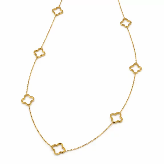 Sautoir doré en acier inoxydable orné de motifs trèfle élégants. Un bijou raffiné et intemporel.