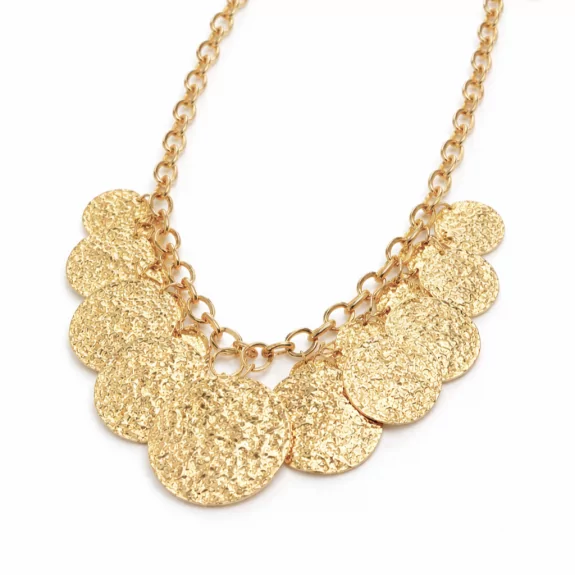 Collier doré à grosses mailles orné de médailles texturées. Un bijou tendance et audacieux.