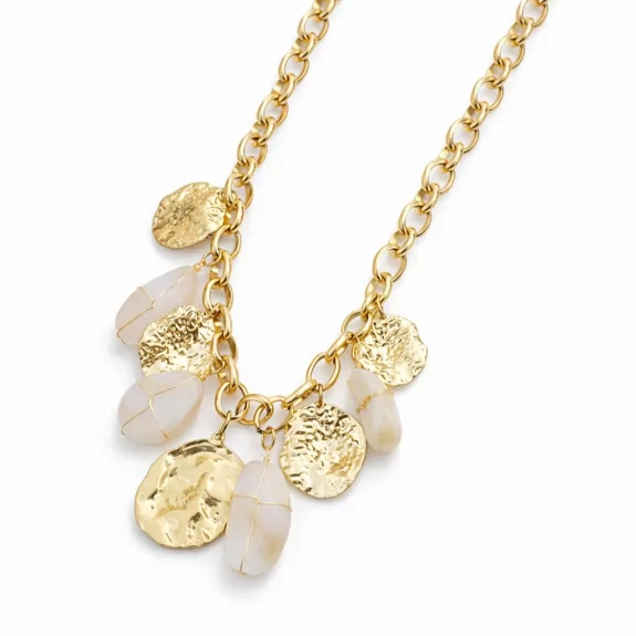 Collier doré élégant avec médailles texturées et pierres naturelles. Un bijou chic et lumineux.