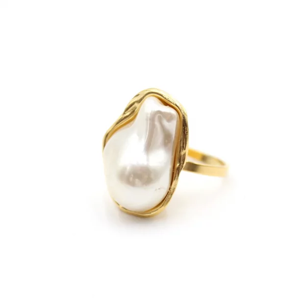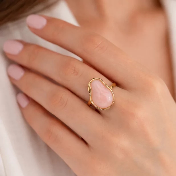 Son design minimaliste met en valeur une pierre cabochon lisse et brillante, aux nuances délicates qui captent la lumière et apportent une touche raffinée au bijou. Sa forme organique et moderne en fait un accessoire facile à porter au quotidien.