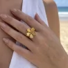 Bague élégante en forme de fleur avec effet texturé. En acier inoxydable, ajustable et disponible en finition argentée ou dorée, parfaite pour un look raffiné et tendance.