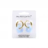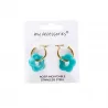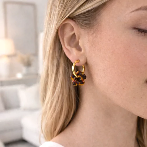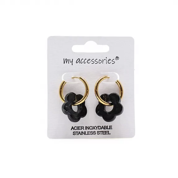 Ce modèle associe un anneau créole doré en acier inoxydable à une fleur en résine colorée, créant un contraste lumineux et moderne. Les différentes couleurs disponibles permettent de proposer un large choix en boutique et de s’adapter à tous les styles.
