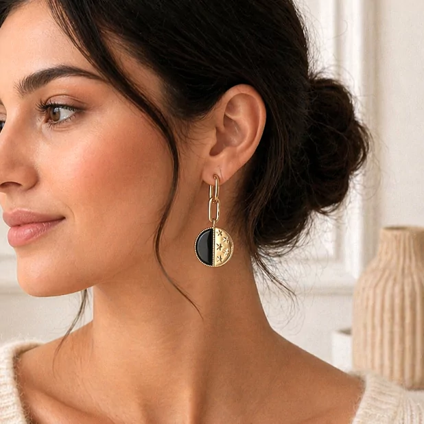 Boucles d’oreilles élégantes avec maillons dorés et médaillon bicolore émaillé, disponibles en plusieurs coloris raffinés.