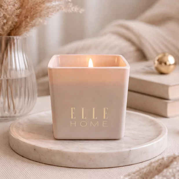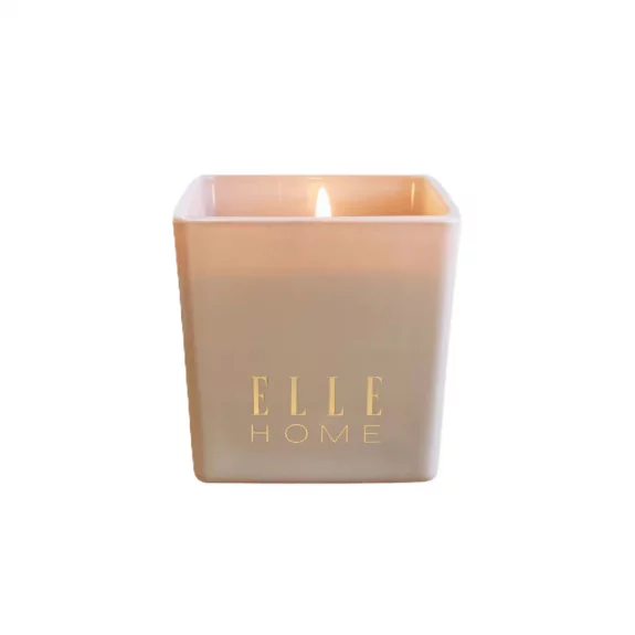 Succombez à la bougie Vanilla ELLE Home 215g. Une fragrance gourmande mêlant vanille, amande et coco, sublimée par la fève tonka.