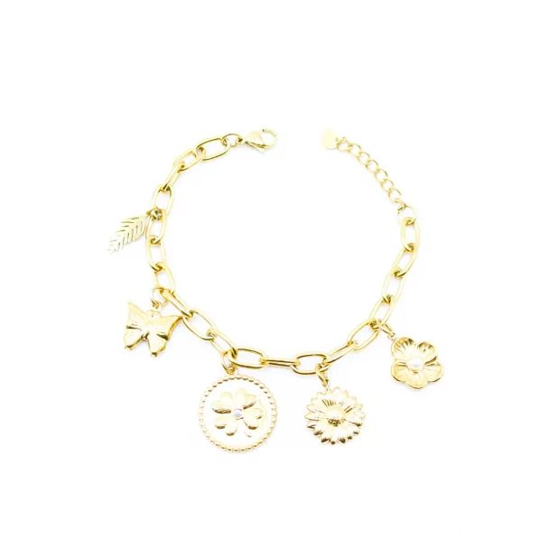 Bracelet avec des breloques dorées en acier inoxydable : trèfle, fleurs, papillon, feuille