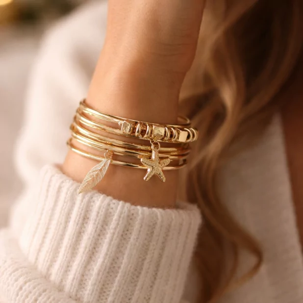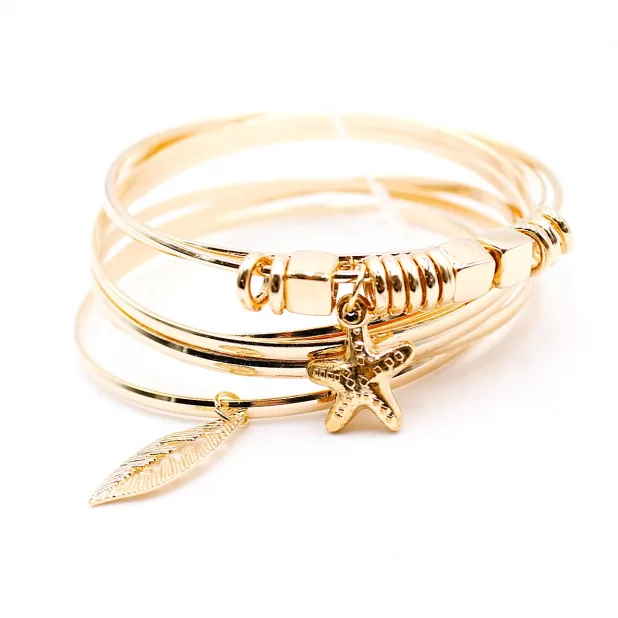 Lot de bracelets joncs dorés avec breloques étoile de mer et plume. Bijoux fantaisie tendance à porter seuls ou en accumulation.