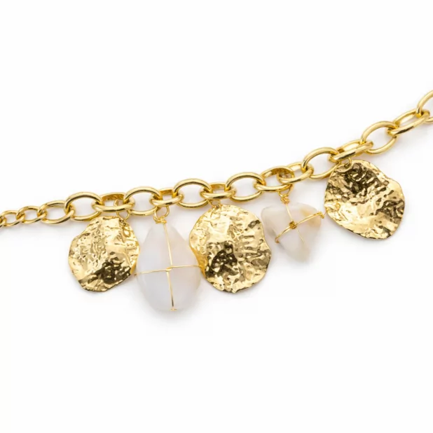 Composé d’une chaîne à maillons dorés, ce bracelet est sublimé par de délicats pendentifs en forme de médailles martelées associés à de pierres naturelles aux teintes douces. Le contraste entre la texture du métal et la douceur des pierres crée un bijou à la fois raffiné et tendance.