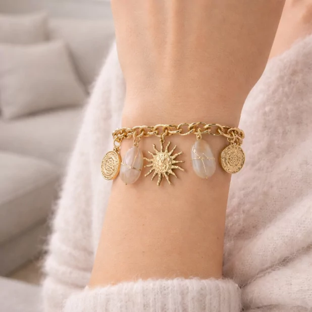 Composé d’une chaîne à maillons dorés, ce bracelet est orné de plusieurs pendentifs délicats : un soleil central finement travaillé, des médailles gravées ainsi que des pierres naturelles aux teintes douces. L’ensemble crée un jeu de textures et de lumière qui sublime le poignet avec élégance.