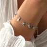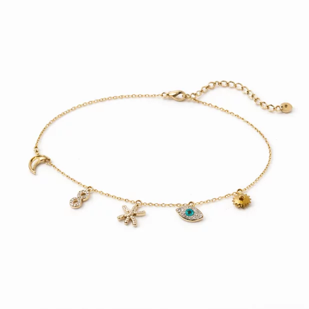 Craquez pour ce bracelet charms en acier inoxydable au style délicat et moderne. Sa chaîne fine met en scène plusieurs pendentifs emblématiques qui donnent au bijou tout son caractère : une lune, un symbole infini, une étoile, un œil bleu et un soleil.