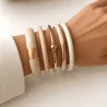 Chaque bracelet apporte une variation subtile de texture et de couleur : tons chauds ambrés, nuances ivoire élégantes ou finitions légèrement transparentes. L’ensemble crée un jeu de contrastes harmonieux, parfait pour un look tendance en accumulation.