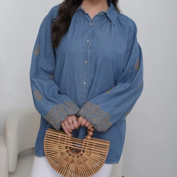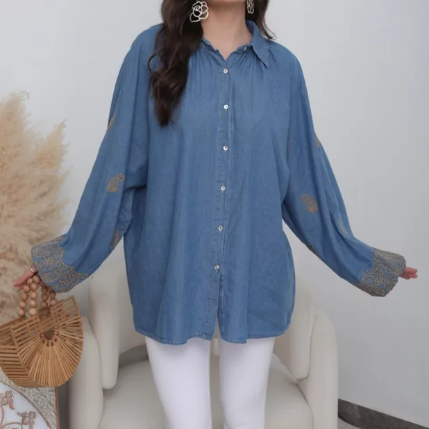 Confectionnée dans un denim léger et agréable à porter, cette chemise femme bohème chic se distingue par ses magnifiques broderies dorées délicatement travaillées sur les manches évasées. Ces détails raffinés apportent une touche lumineuse et sophistiquée qui séduira immédiatement votre clientèle.