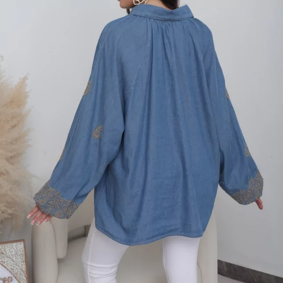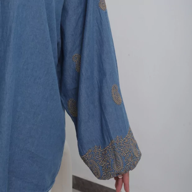 Blouse en jean bleu ornée de broderies dorées sur les manches. Coupe fluide, style bohème chic, parfaite pour les collections printemps/été. Disponible en vente en gros chez Référence Mode.