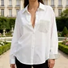 Chemise femme au tissu unique avec poche contrastée. Coupe fluide et moderne. Composition 65% coton, 35% polyester. Disponible en vente en gros chez Référence Mode.