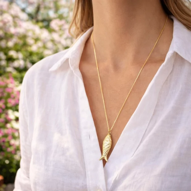 Sautoir doré en acier inoxydable avec un pendentif poisson