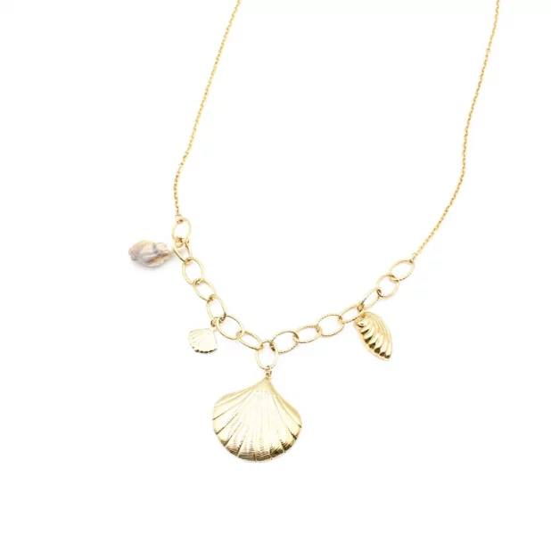 Sautoir doré en acier inoxydable avec plusieurs breloques coquillages