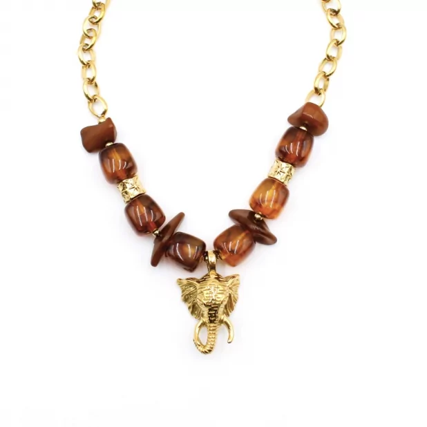 Collier en acier inoxydable avec résine marron et pendentif motif éléphant