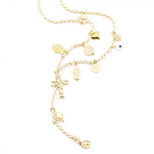 Collier cordage fil lurex avec des breloques en acier inoxydable motif coeur, croix...