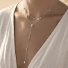 Ce modèle se compose de deux chaînes fines superposées, sublimées par de délicats détails sertis et une chute centrale élégante terminée par un pendentif en forme de goutte. Son design fluide met parfaitement en valeur le décolleté et apporte une touche sophistiquée à toutes les tenues.