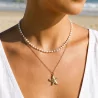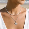 Collier double rang en acier inoxydable avec perles fines et pendentif étoile de mer. Style bohème chic, résistant à l’eau, finition argentée ou dorée.