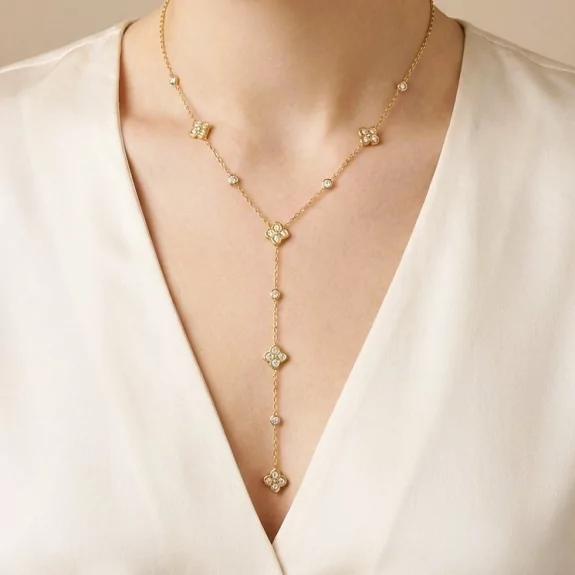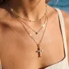 Ce modèle se distingue par ses trois chaînes fines superposées créant un effet de superposition très apprécié dans les tendances actuelles. La première chaîne est décorée de petites perles métalliques délicates, la seconde met en valeur une pierre brillante centrale, tandis que la troisième chaîne se termine par un pendentif croix serti de strass scintillants, apportant une touche lumineuse et sophistiquée.