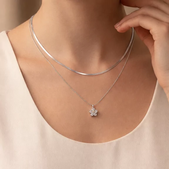 Ce bijou raffiné se distingue par sa chaîne fine agrémentée de petits trèfles ajourés et de perles délicates, créant un design à la fois moderne, féminin et intemporel. La combinaison des motifs trèfles et des perles apporte une touche lumineuse et élégante qui met en valeur le décolleté.