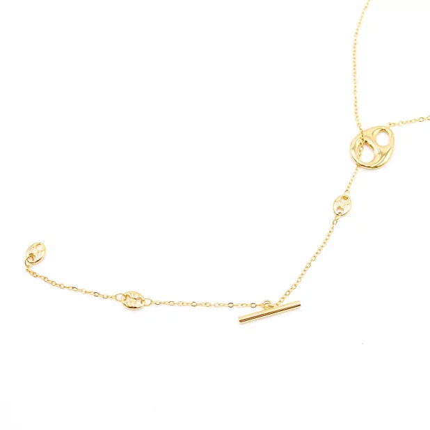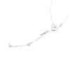 Son design raffiné se distingue par une chaîne fine agrémentée de détails métalliques et d’un pendentif allongé, créant un effet vertical délicat qui met en valeur le décolleté. Les éléments décoratifs apportent une touche contemporaine et élégante, idéale pour un style chic et minimaliste.