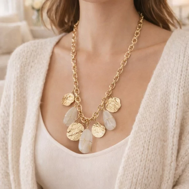 Sa chaîne à maillons dorés est sublimée par une composition harmonieuse de pendentifs effet martelé et de pierres naturelles aux teintes douces. Chaque élément capte la lumière et apporte du relief, pour un rendu à la fois lumineux et sophistiqué.