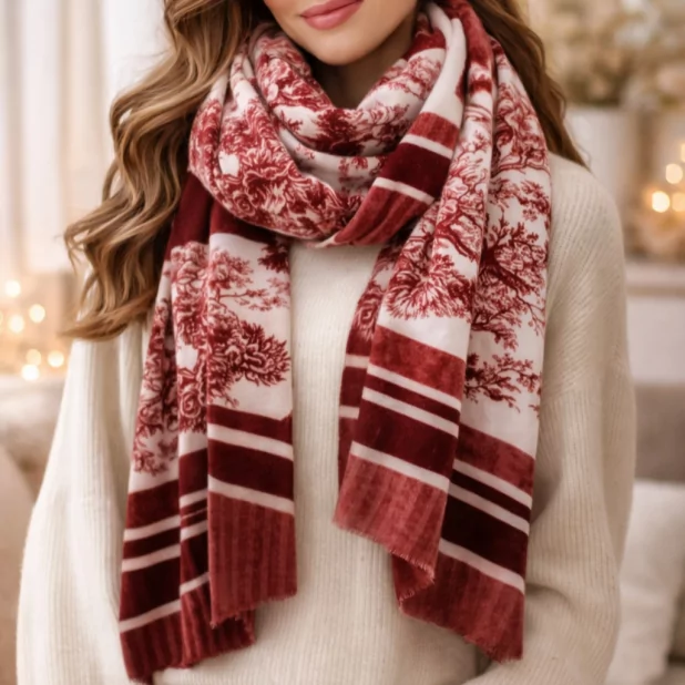 Echarpe tendance aux motifs esprit toile de jouy, disponible en plusieurs coloris