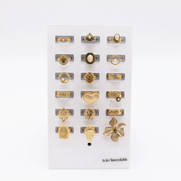 ✨ Chaque bague est méticuleusement fabriquée en acier inoxydable de haute qualité, garantissant durabilité et brillance durable. Les finitions impeccables et les couleurs vives font de ces bagues des accessoires indispensables qui captiveront l'attention de vos clients et ajouteront une touche de sophistication à leur look.