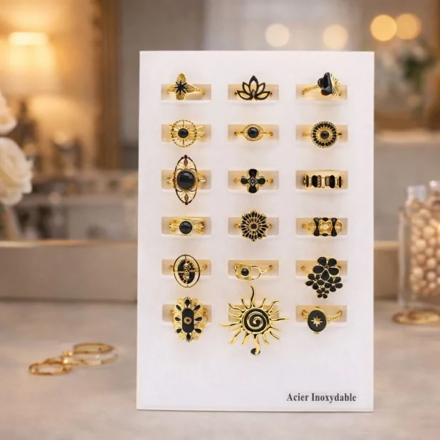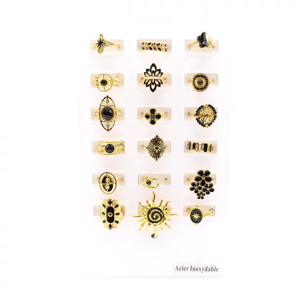 Chaque bague présente un motif unique : inspirations bohèmes, florales, graphiques ou solaires, avec de subtiles touches noires qui contrastent parfaitement avec la finition dorée. Un assortiment idéal pour varier les looks ou proposer une offre attractive à vos clientes.
