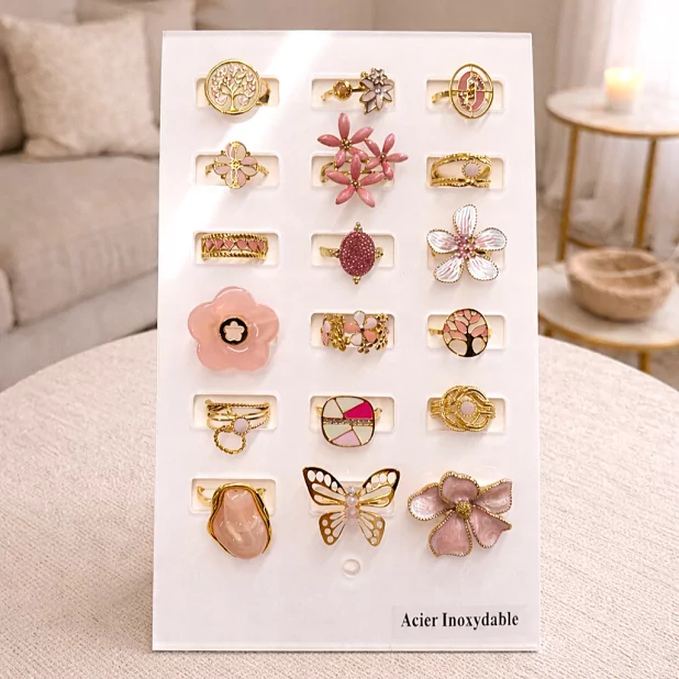 Chaque bague présente un motif unique : inspirations bohèmes, florales, graphiques ou solaires, avec de subtiles touches noires qui contrastent parfaitement avec la finition dorée. Un assortiment idéal pour varier les looks ou proposer une offre attractive à vos clientes.