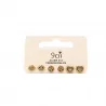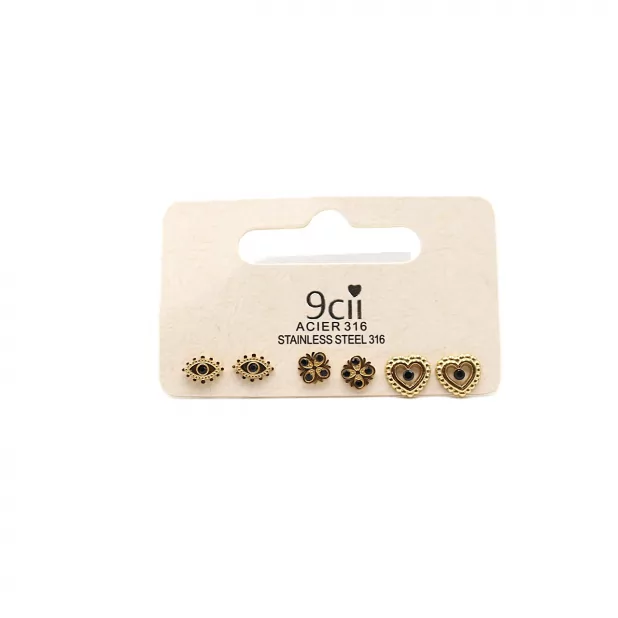 Pack de petites boucles d’oreilles en acier inoxydable avec différents motifs tendance. Modèles discrets et élégants disponibles en plusieurs couleurs.