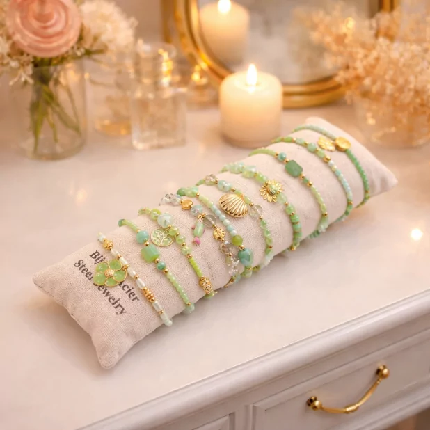 Chaque bracelet est composé de perles en cristal de verre, associées à des éléments en acier inoxydable doré : coquillages, fleurs, soleils et médaillons délicats. Un ensemble harmonieux, idéal à porter seul ou en accumulation pour un effet bohème chic très tendance.