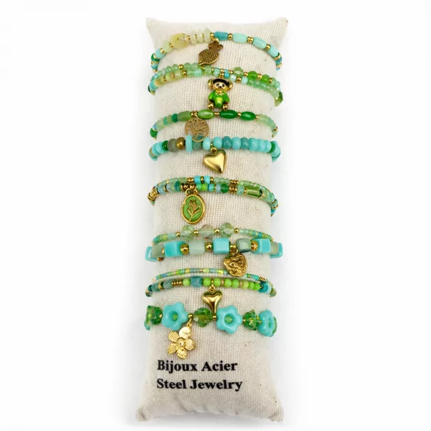 Chaque bracelet est composé de perles en cristal de verre, associées à des éléments en acier inoxydable doré : coquillages, fleurs, soleils et médaillons délicats. Un ensemble harmonieux, idéal à porter seul ou en accumulation pour un effet bohème chic très tendance.