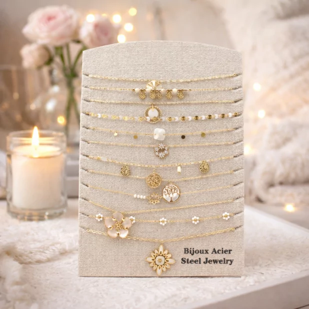 🎁 Ce lot de colliers en acier inoxydable est un choix idéal pour les bijouteries, les étals des marchés artisanaux et toute entreprise de vente au comptoir. Proposez à vos clients une sélection variée de colliers pour tous les goûts et toutes les occasions, tout en augmentant vos ventes et en fidélisant votre clientèle.