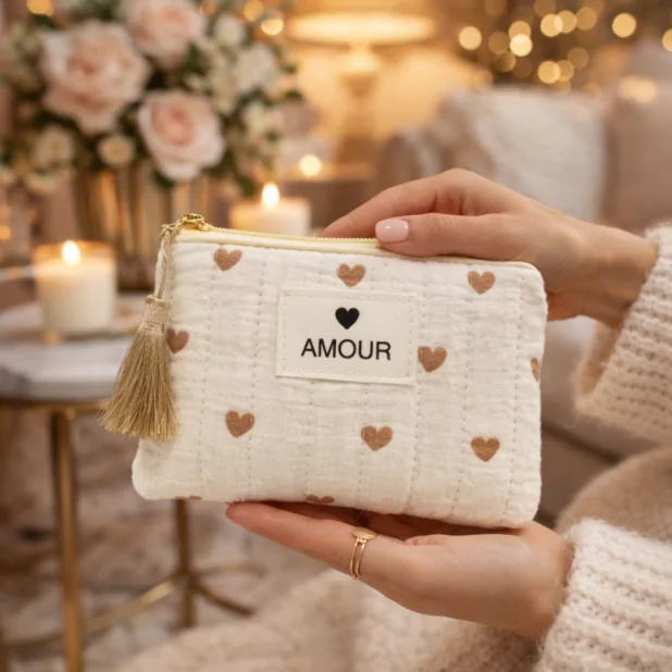 Petite pochette avec motifs cœurs et un message - AMOUR