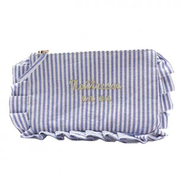 Pochette tendance à rayures avec message brodé “Maîtresse en or”. Un accessoire pratique et stylé, idéal comme idée cadeau. Format compact 17x10 cm, disponible en plusieurs coloris.