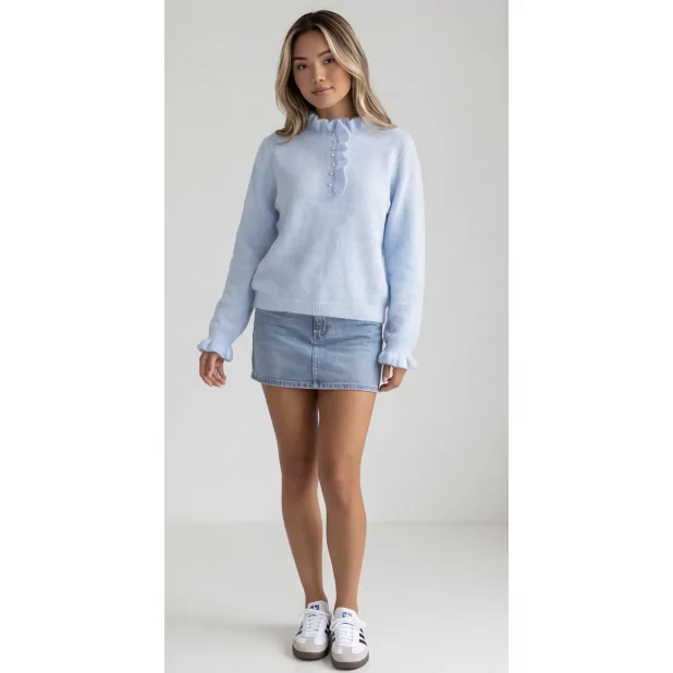 Son col légèrement volanté orné de boutons décoratifs façon perles