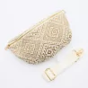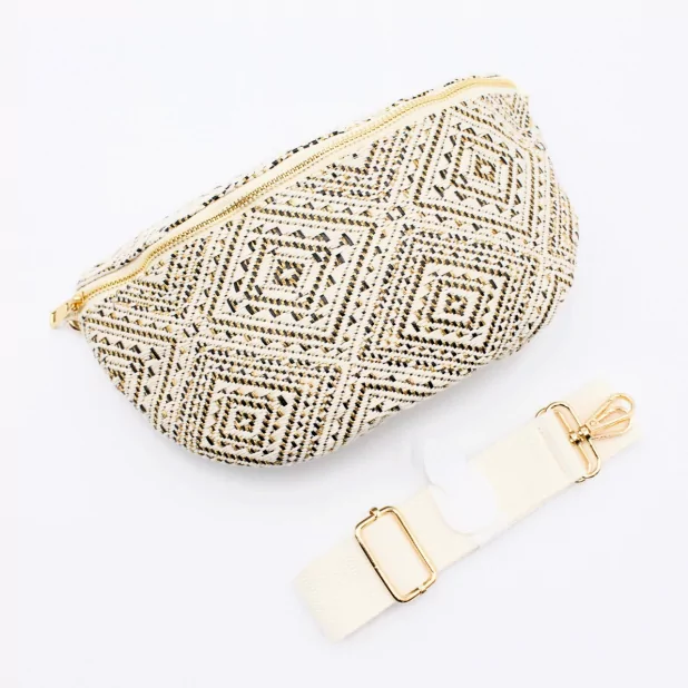 Sac à main façon banane avec lurex doré et une anse large. Une grande poche sur le devant fermée par fermeture éclair. Vous avez également une poche intérieure avec une fermeture éclair.