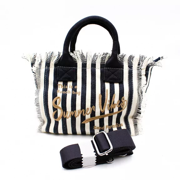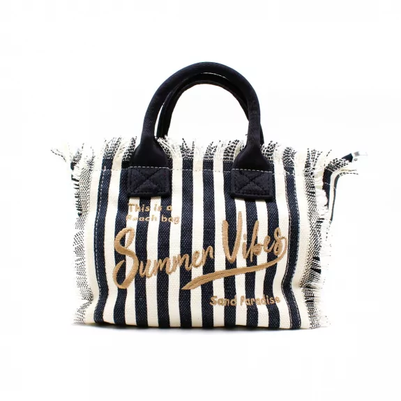 Petit sac à main rayé esprit bord de mer en 100% polycoton. Dimensions 25 cm x 18 cm. Idéal pour l’été, avec poignées et bandoulière. Modèle tendance parfait pour boutiques de prêt-à-porter féminin.