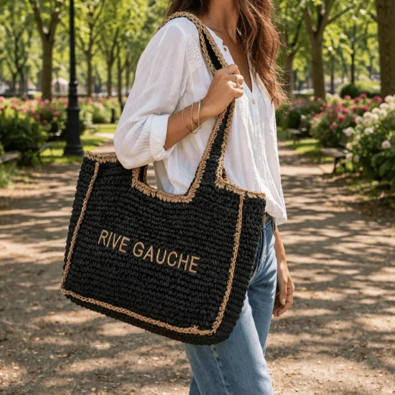 Grand sac cabas en papier avec inscription "RIVE GAUCHE". Spacieux, tendance et idéal pour un usage quotidien ou estival.