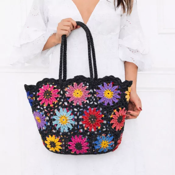 Apportez une touche de fraîcheur et de couleur à votre collection avec ce panier en crochet à motifs floraux.
